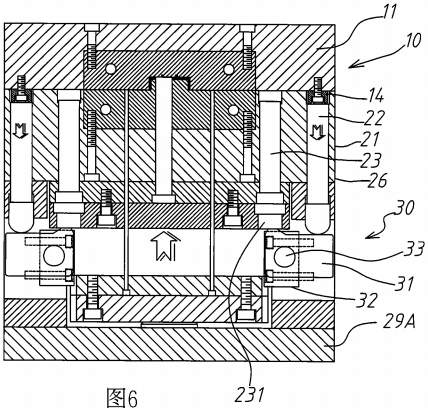 这个向上移动,使得模具内部用来顶出“1”的第一根顶针(第一顶针)的顶端正好紧贴模具型腔壁(靠破),形成密封。